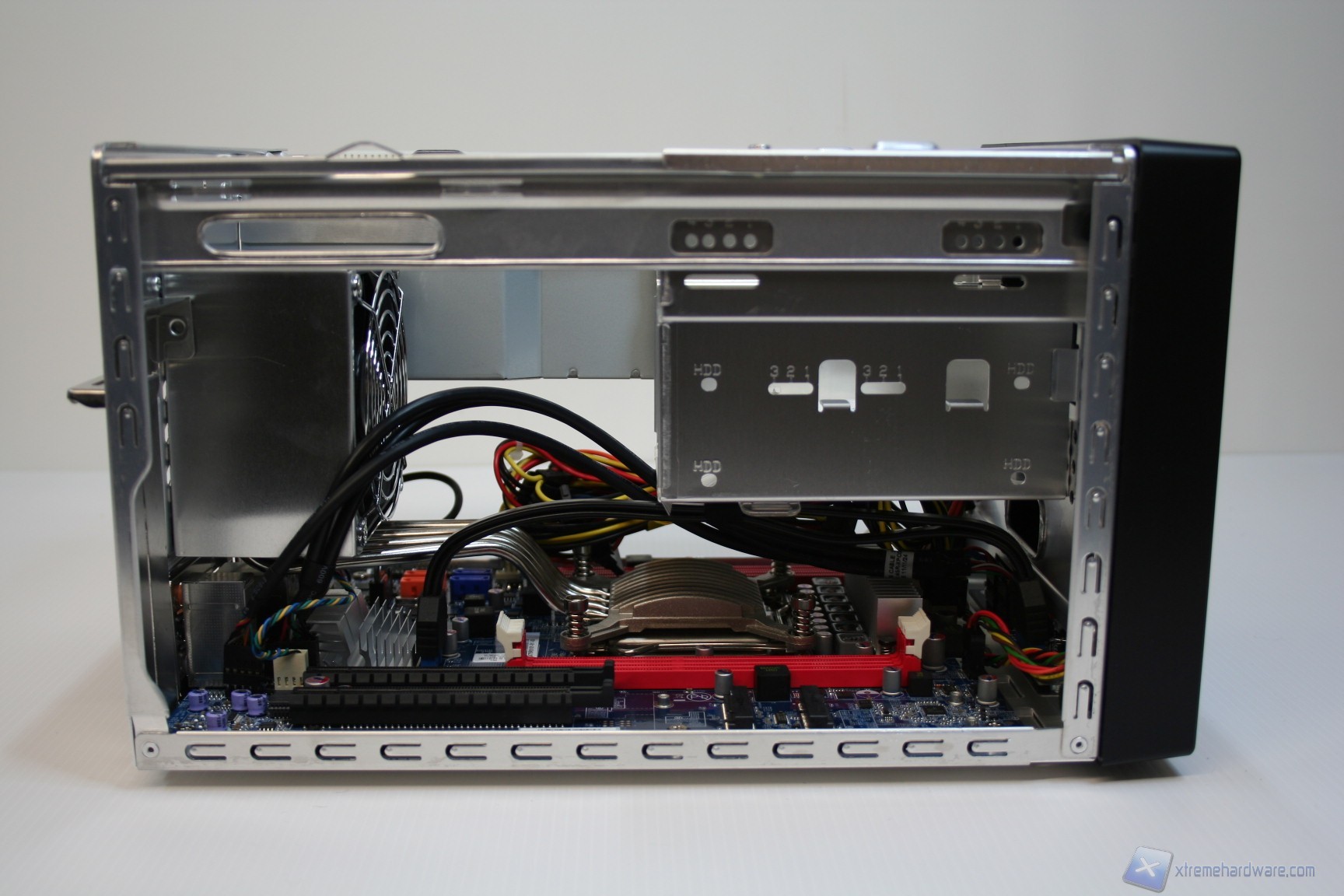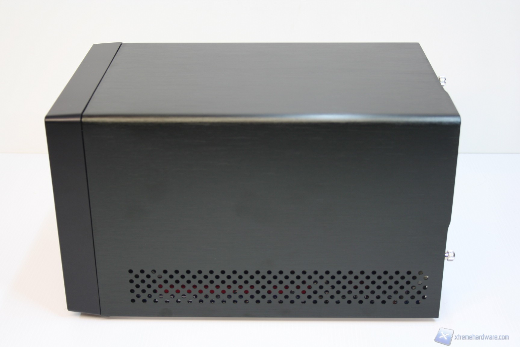 La parte superiore e quella laterale, sinistra e destra, sono un blocco unico di alluminio ed è possibile rimuoverle semplicemente tramite la rimozione di tre viti, nella parte posteriore. La parte inferiore invece presenta 4 piedini di materiale plastico che gli conferiscono stabilità e rigidezza evitando vibrazioni all’intero chassis. Posteriormente è presente la ventola da 50mm dell’alimentatore, l’ingresso del cavo di alimentazione, le feritoie di aerazione del dissipatore ed anche le connessioni della scheda madre. La solidità strutturale è ottima, come il layout e la pulizia delle finiture. Cosa interessante è che è presente anche un connettore eSATA di potenza, per alimentatore hard disk esterni, ma soprattutto un pulsante per resettare il CMOS del BIOS (ClearCMOS). E’ possibile anche osservare il seriale posteriormente, come si vede nella foto in questione.
