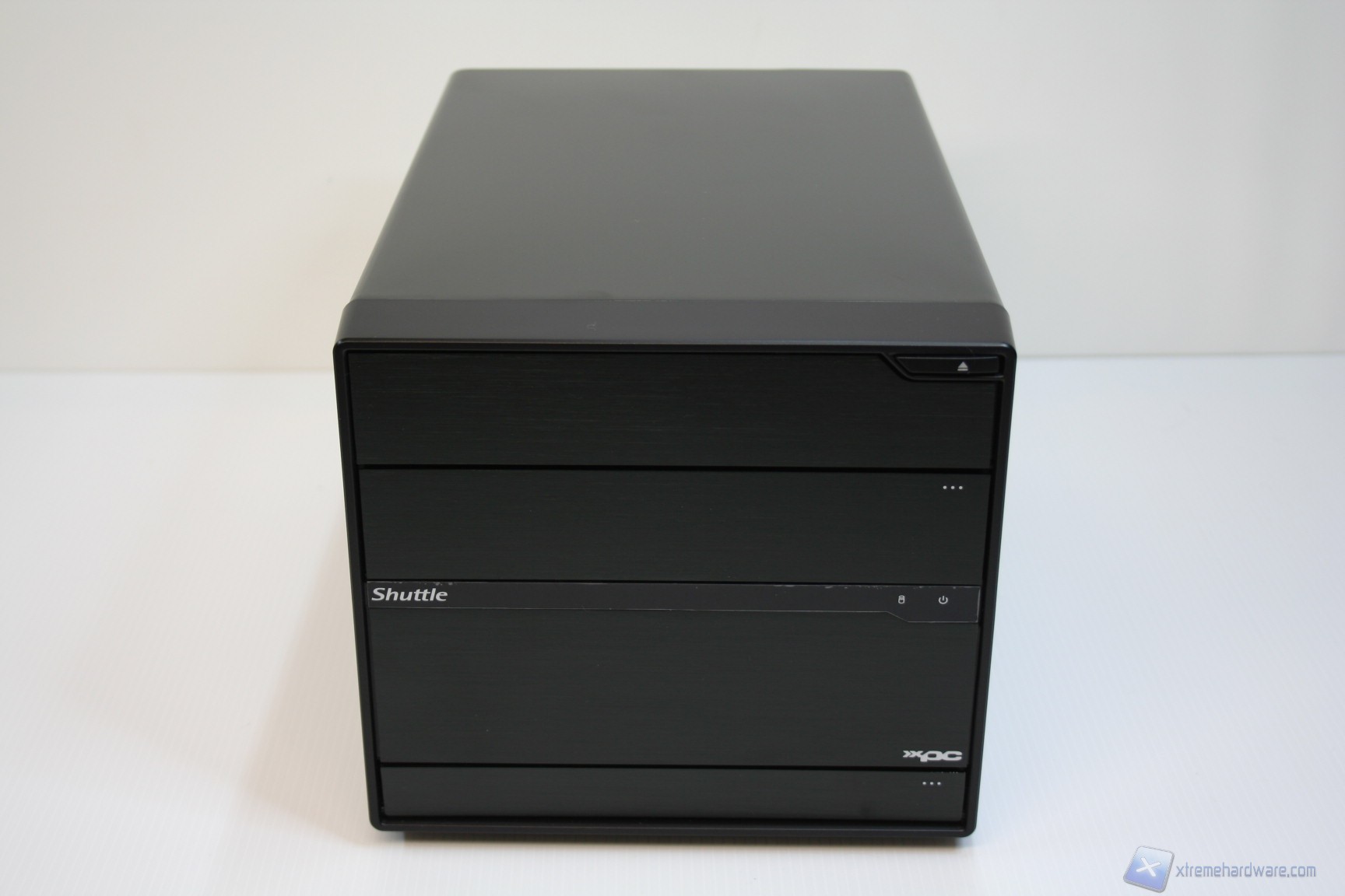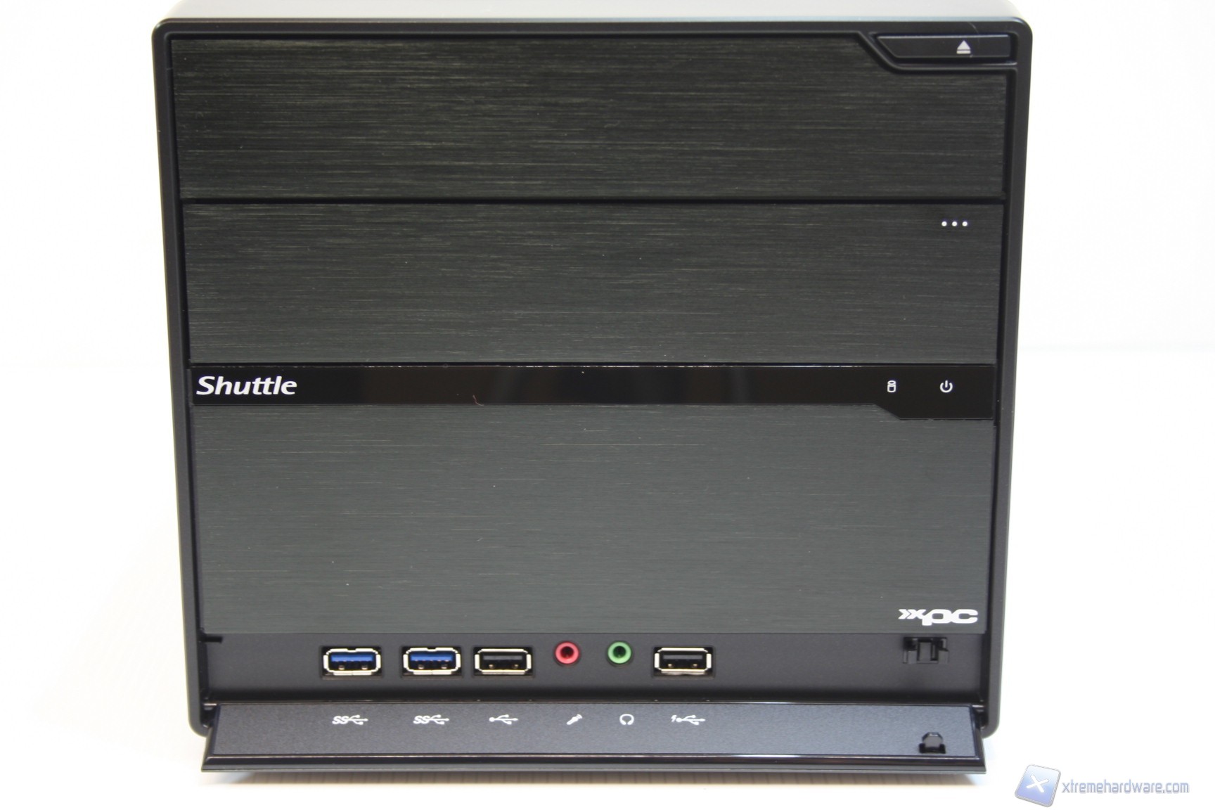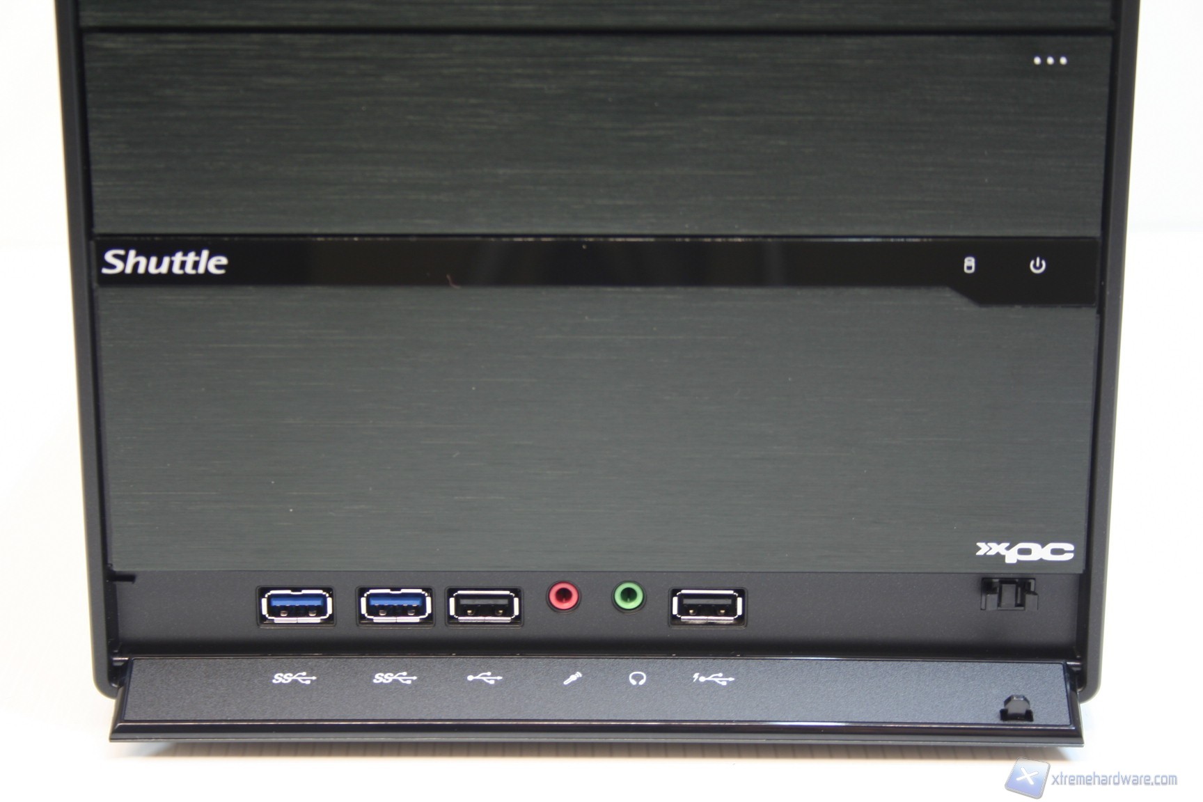 La parte frontale è molto elementare, pulita ed ordinata, con paratie a scomparsa. Presenta due porte USB 3.0 frontali (2x posteriori), due porte USB 2.0 (4x posteriori), un’entrata per il microfono ed una per le cuffie, con jack da 3.5’’. Nella parte superiore della paratia frontale è inoltre presente l’ingresso del lettore ottico, mascherato dietro uno sportellino a scomparsa assieme a quella per un’unità da 2.5’’. La pressione del pulsante ‘’eject’’ permetterà quindi la fuoriuscita del carrello di inserimento del lettore DVD, che poi verrà nascosto nuovamente a causa di un meccanismo a molle orizzontali. Precisiamo che sarebbe possibile installare un singolo bay hot swap, ma deve essere acquistato separatamente, per sfruttare il cage hard disk da 3.5 pollici. Nella parte centrale è presente una piccola finitura opaca con impresso il logo shuttle, nella parte sinistra, mentre nella parte destra sono presenti i LED Hard Disk e di accensione, il quale funziona anche da pulsante ON/OFF dell’unità.